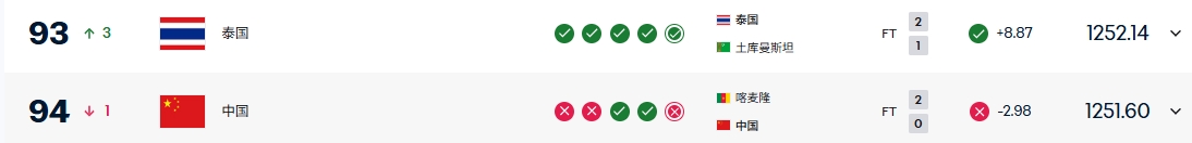 泰国击败土库曼斯坦获得了8.87个积分,国足0-2不敌喀麦隆扣除2.98个积分。